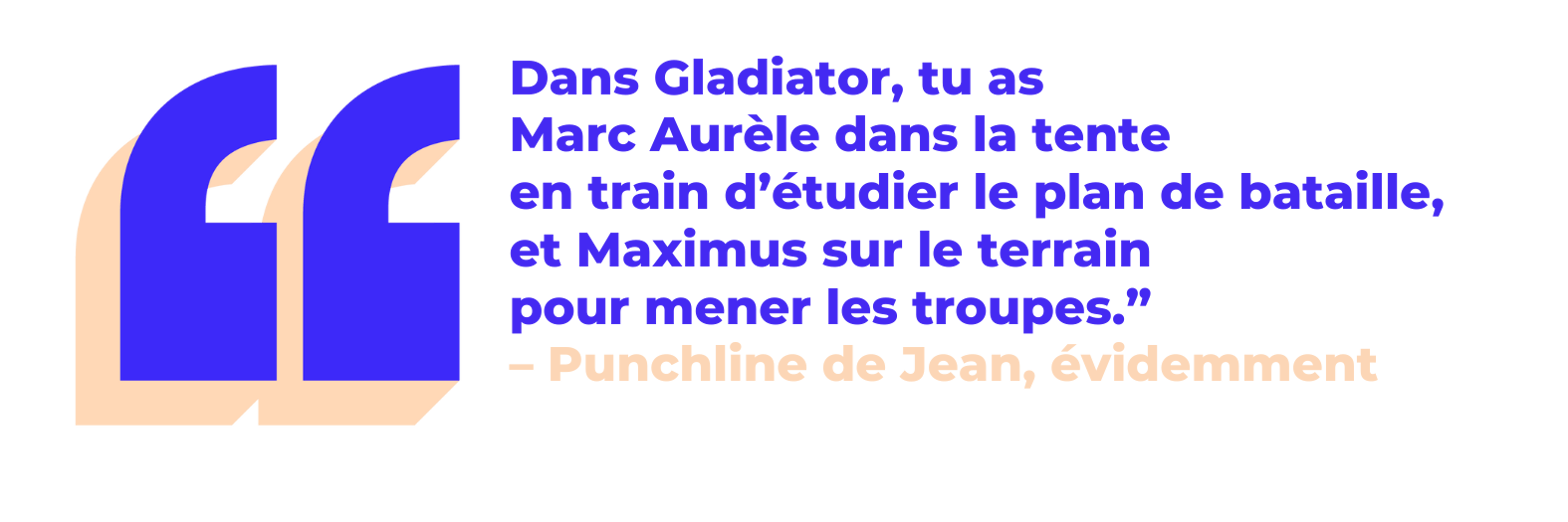 Mais blague à part, la lucidité c’est un peu ça : trouver l’équilibre entre son Marc-Aurèle et son Maximus intérieurs, car les deux sont essentiels. Pour ça, il faut s'assurer que tous les sujets puissent être verbalisés quelque part : avec son associé, son coach, son psy, ses potes — peu importe, tant qu'il n'y a pas d'angle mort. Le coaching est là pour apporter cette perspective extérieure (si ça vous intéresse, faites-nous signe), mais c’est tout un système de dialogue à construire.