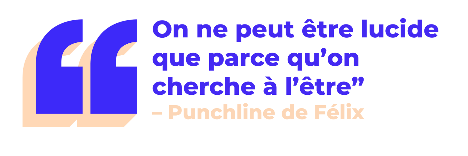 Notre duo, c'est un peu le yin et le yang de la lucidité : Jean c’est l’énergie du fonceur, Félix c’est l’analyse et la prudence. Or, on peut foncer avec entrain dans la mauvaise direction, ou s’enferrer dans la réflexion au point de rester immobile. On a réalisé que la lucidité naissait à la rencontre de ces deux pôles : douter juste assez pour faire les bons choix à temps et éviter l’épuisement et le crash, mais sans saper son énergie et sa motivation pour avancer.